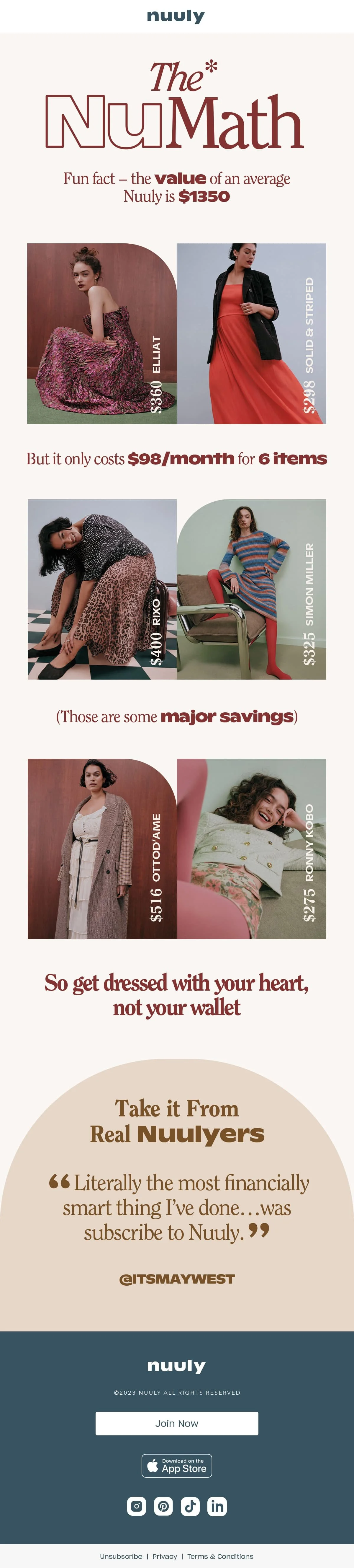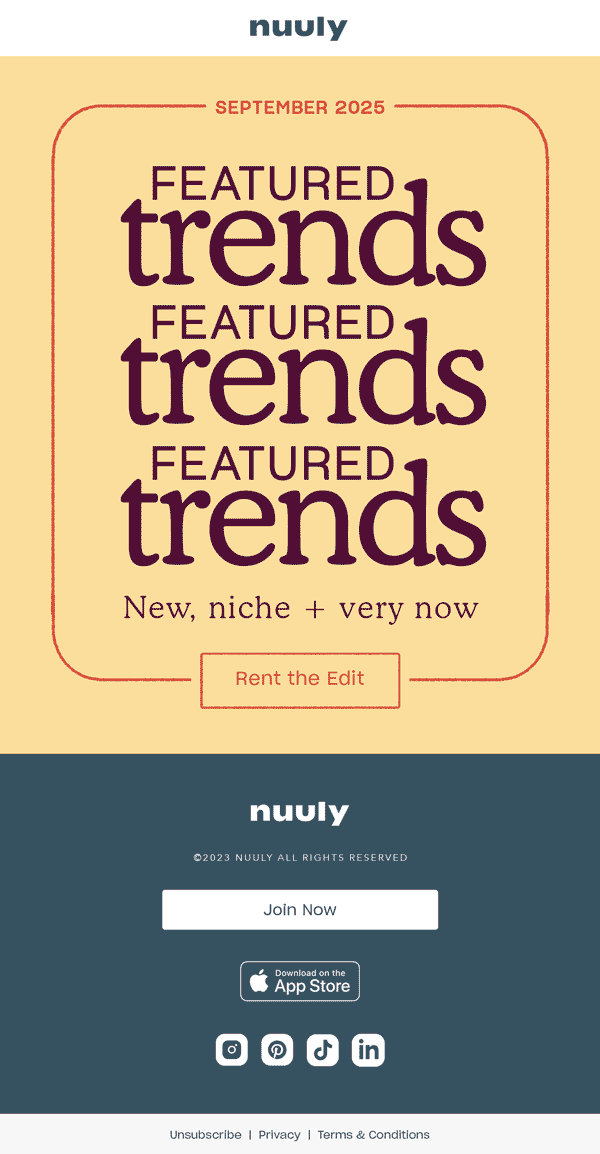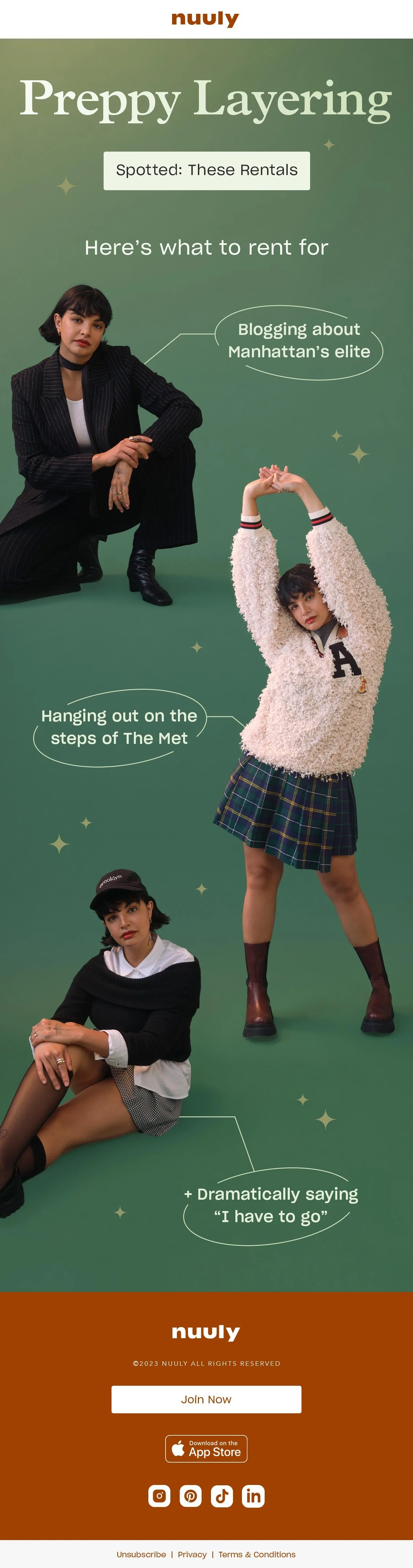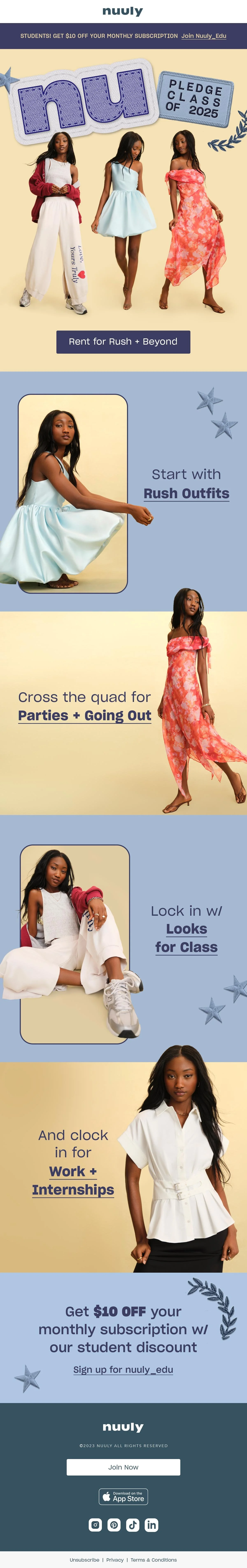 I currently work at Nuuly in Philadelphia PA as a member of the creative team. I contribute digital assets for use across multiple channels. Below are some of the projects I have made in collaboration with very talented copywriters.